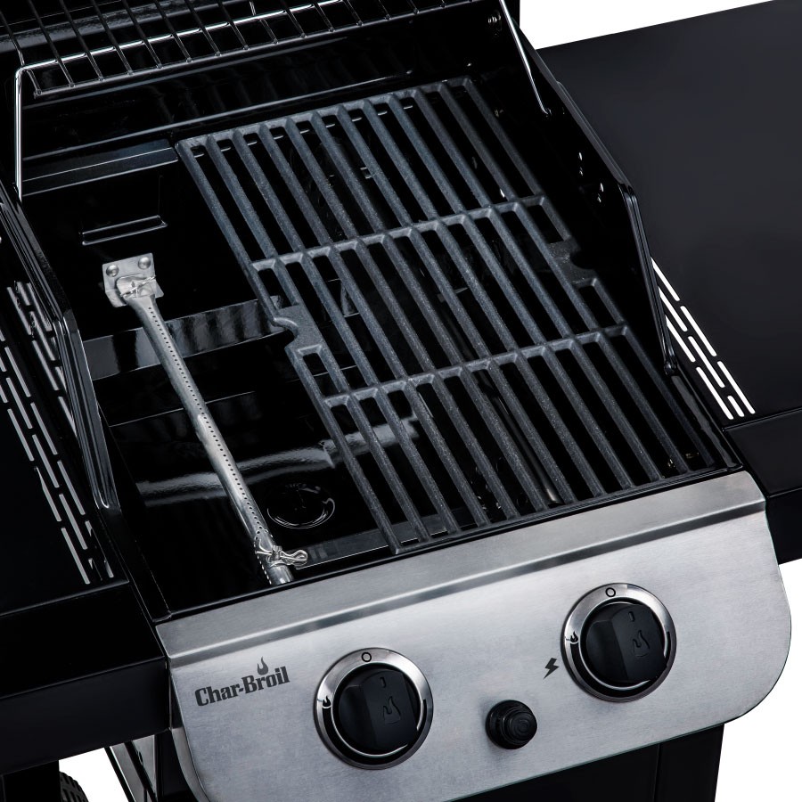 The Convective 2-burner grill features a modern black steel cart design and the stainless steel burners emit flame from the top for even cooking and added durability. This grill is made to last, with cast iron grates for perfect sear marks and easy cleaning. All the features are here, including a removable porcelain-coated grease pan and an electronic igniter.