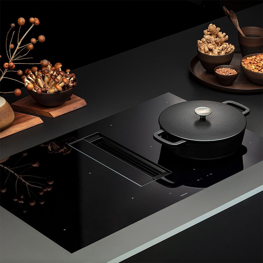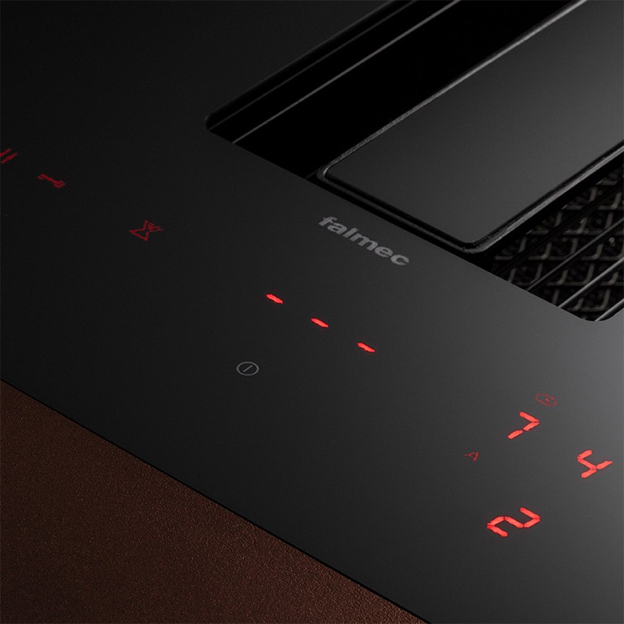 The Falmec Zero system combines induction cooking and built-in extraction into a sleek black glass-ceramic surface. With four Flex Zone burners offering up to 9 power levels plus boost, automatic pan detection, and programmable timers, it delivers intuitive control and efficiency. Vapor is captured by a sliding central extraction panel that adjusts suction up to 600 m³/h via AutoMode, while touch-slider operation and whisper-quiet motor keep the experience seamless. Designed for compact kitchens, Zero blends minimalist elegance with advanced functionality.