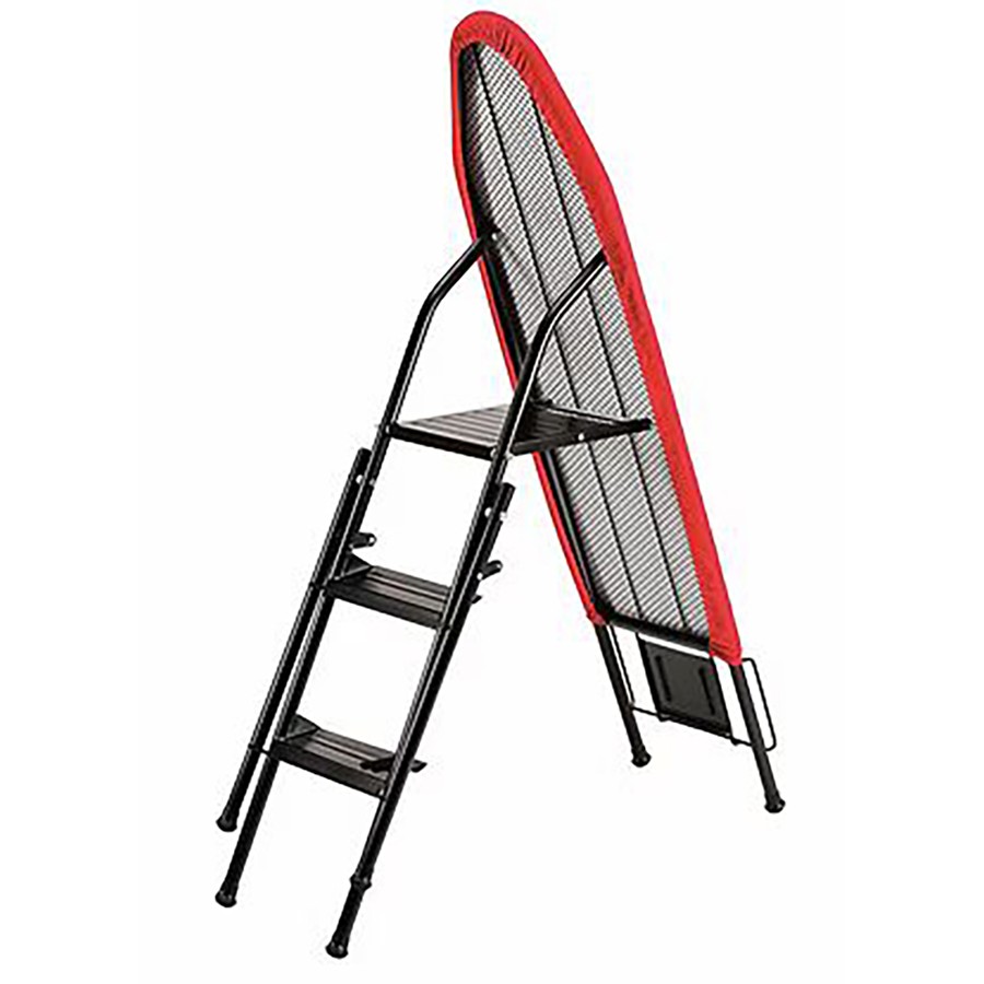 This versatile product combines a sturdy 3-step stepladder with a practical ironing board. Designed for convenience and safety, it features a plush cotton cover, anti-slip support, and a foldable design for easy storage. The black and red finish adds a modern touch, while its stable construction ensures reliable use for ironing or reaching high spaces. Perfect for both dry and steam ironing.