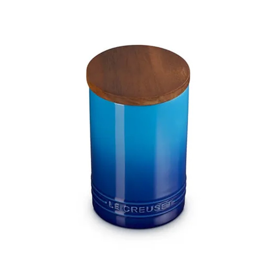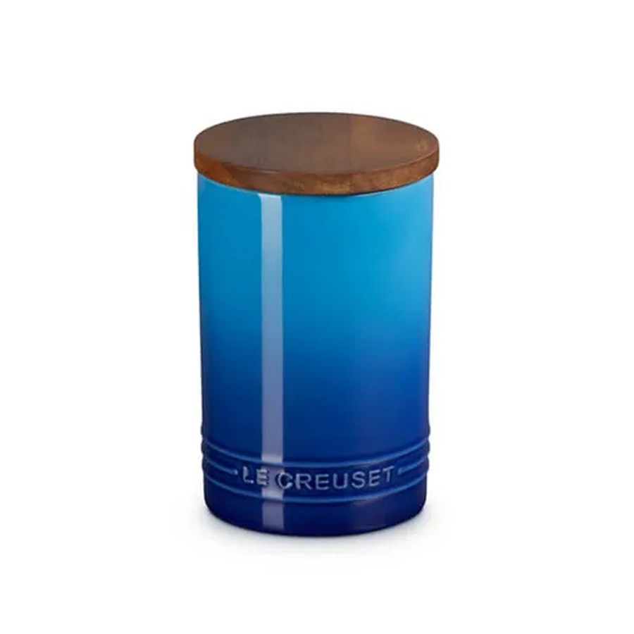 Crafted from premium Le Creuset stoneware with a snug acacia wood lid and silicone seal, the Storage Jar 770 ml in Azure Blue (SKU 70819772200099) is ideal for keeping kitchen essentials like tea, coffee, sugar or grains fresh and organized while adding a refreshing pop of colour to your countertop. Its durable high-fire stoneware construction resists scratches and chips and is easy to clean, while the airtight lid helps protect contents from moisture and preserves flavour.
